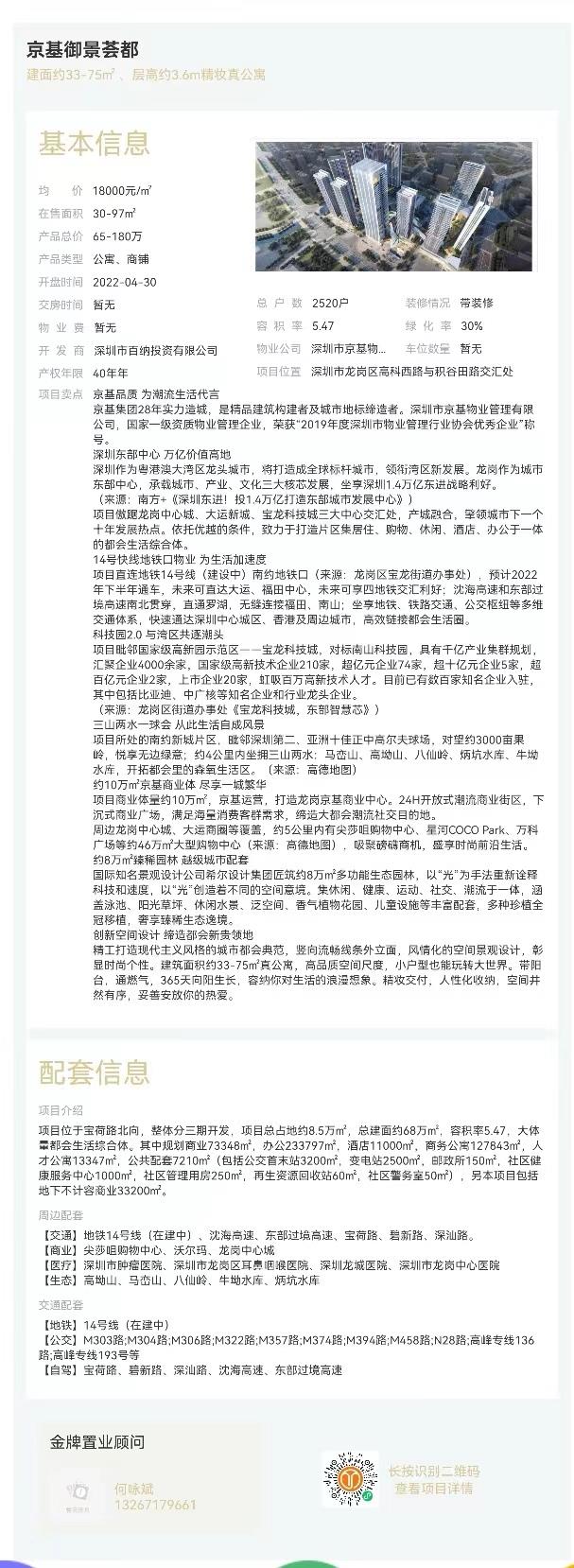 項(xiàng)目位于龍崗區(qū)寶荷路與寶荷路支線交叉口寶荷欣苑西側(cè),是由京基打造的,依山腳而建,占地面積約63454 81㎡,總建筑面積約為22萬㎡,容積率