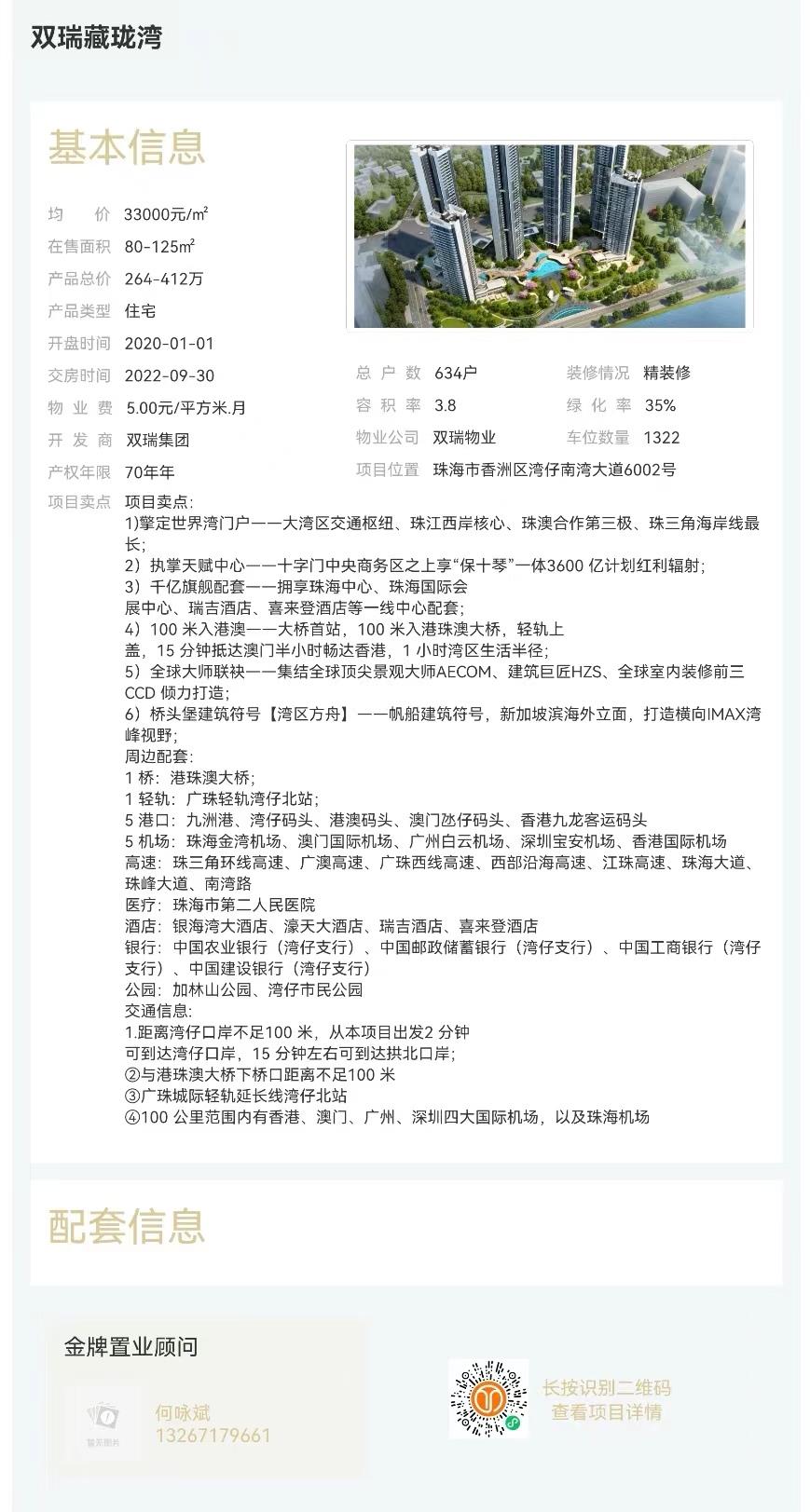 2)執掌天賦中心——十字門中央商務區之上享“保十琴”一體3600 億計劃紅利輻射; 3)千億旗艦配套——擁享珠海中心、珠海國際會展中心、瑞吉酒店、喜來登酒店等一線中心配套; 4)100 米入港澳——大橋首站,100 米入港珠澳大橋,輕軌上蓋,15 分鐘抵達澳門半小時暢達香港,1 小時灣區生活半徑; 5)全球大師聯袂——集結全球頂尖景觀大師AECOM、建筑巨匠HZS、全球室內裝修前三CCD 傾力打造;