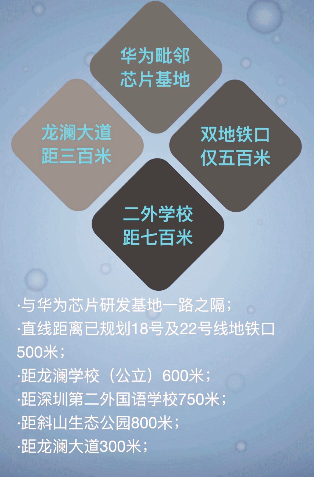2 ,華為總部芯片基地選址大水坑,與本項(xiàng)目距離20米,華為駕到,吾皇萬(wàn)歲,房?jī)r(jià)暴拉3倍+,50萬(wàn)買(mǎi)房,2年后見(jiàn)證第二個(gè)坂田,財(cái)富秒變150萬(wàn)。
